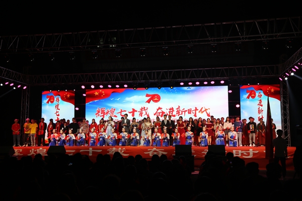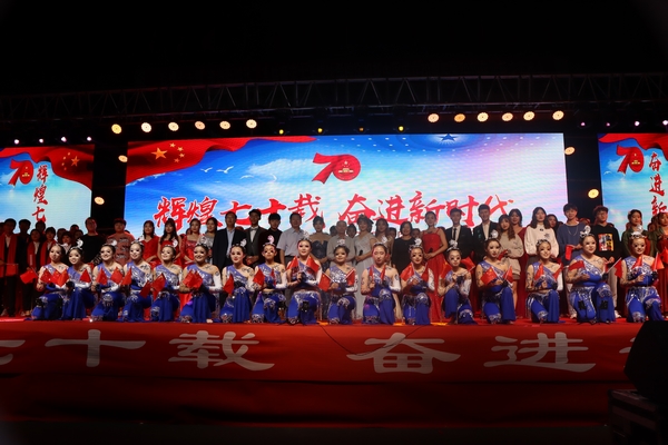 博达舞团和数学学院的街舞表演拉开了晚会的帷幕。管理学院带来的舞蹈《我编斗笠送红军》唤起了师生对红色年代峥嵘岁月的历史回忆。文学院副院长赵丹撰稿,文学院院长侯云龙、外国语学院副院长徐东以及2017级、2018级、2019级同学带来的诗朗诵《逐梦》,展现了博达人在面对新转折,新思路,新举措的过程当中,坚持不懈、持之以恒不断追求卓越的精神。外国语学院的古典舞《九月吟唐》,幽幽古风,令人沉醉的,柔中带刚,刚中有韧。五星红旗我们为你骄傲,五星红旗,我们为你自豪,为你欢呼为你祝福,你的名字比我的生命更重要!学前与小学教育学院师生演唱的《红旗飘飘》,昭示着信心和力量。体育学院表演的《啦啦操》,展现青春的激情、永不停止的追求。2017级、2018级、2019级同学共同带来的歌曲联唱中,管理学院的侯洋、栾金洋、郎岚、叶益益演唱的《重返十七岁》,伴着动人心弦的音乐,浩瀚无垠的星空,让观众动容。傣族舞《勐兰雀舞》浓郁的民族文化色彩, 极尽东方韵致。歌舞《美好新时代》唱出了国家翻天覆地的变化,老百姓的幸福生活。千人合唱《我和我的祖国》台上台下交相呼应,现场气氛逐渐进入顶峰,用歌声让心中爱国之情冲破云霄,拳拳报国之心唱给祖国。一个个精心编排的节目,集中展现了博达学子奋发有为、蓬勃向上的精神风貌,充分表达了全校师生不忘初心、牢记使命,坚定不移跟党走,为祖国奉献青春的坚定决心。