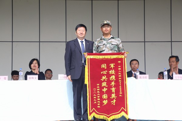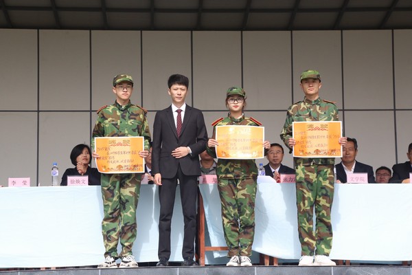 学生处处长张宏源宣布军训综合评比成绩。与会领导为获奖集体和个人颁发了荣誉证书。军训评选出8支“先进连队”,263名“军训标兵”,44个“内务先进寝室”。王国军向部队赠送锦旗。