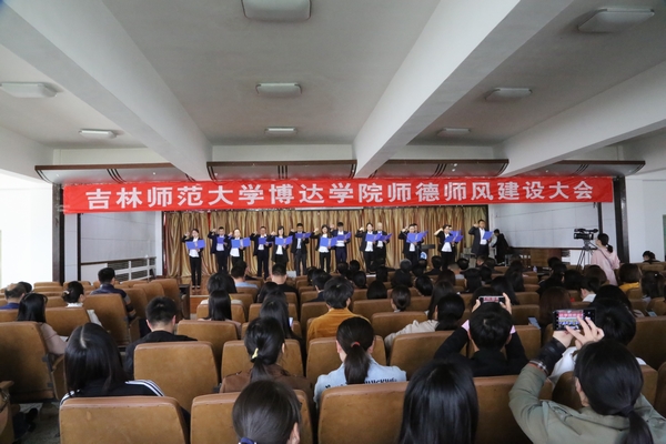 为贯彻习近平总书记在全国学校思想政治理论课教师座谈会上的重要讲话精神,进一步落实《新时代高校教师职业行为十项准则》,强化立德树人的根本任务,提高民办高校教师思想政治素质和职业道德水平,努力建设一支政治要强,情怀要深、思维要新、视野要广、自律要严、人格要正的教师队伍,吉林师范大学博达学院于5月8日召开了师德师风建设大会。